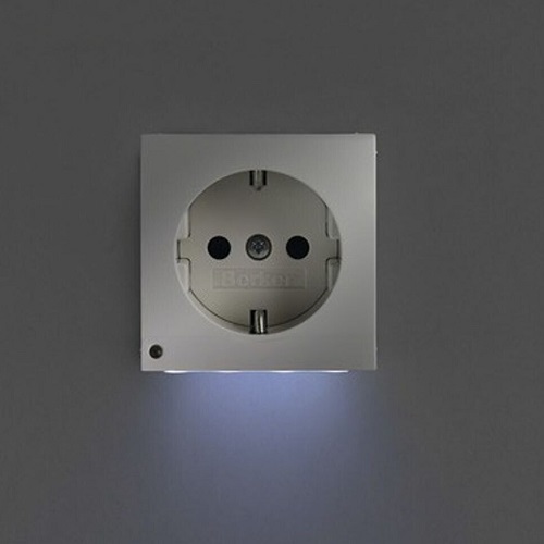 Priză SCHUKO cu protecție copii, lumină LED de orientare și senzor de luminozitate integrat (funcție de nivelul luminii, activează pornirea/oprirea luminii LED de orientare).