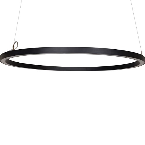 Corp iluminat LED circular, montaj suspendat ajustabil, conferă un aspect contemporan, minimalist.