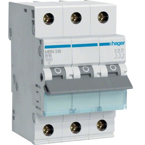 Hager MCB- Disjunctor 3P, 16A, 6kA, curba B, 3M, Bi-Connect