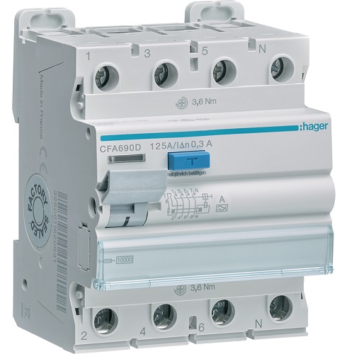 Hager RCCB- Întrerupător Diferențial 4P (3P+N), 125A, 300mA, 6kA, tip A, 4M, Bi-Connect